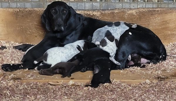 Puppies will be dewormed and given first vaccinations. They will come with NAVHDA registration paperwork and a small bag of puppy food. We socialize our pups daily with the pack as well as introduction to gunfire.